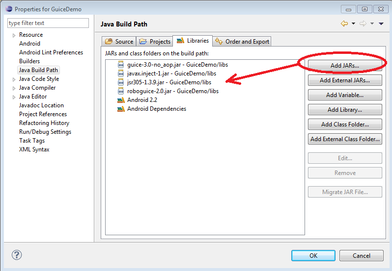 添加了對應guice 和roboguice庫的引用之後,就可以開始編寫第一個使用 roboguice2 的例子。