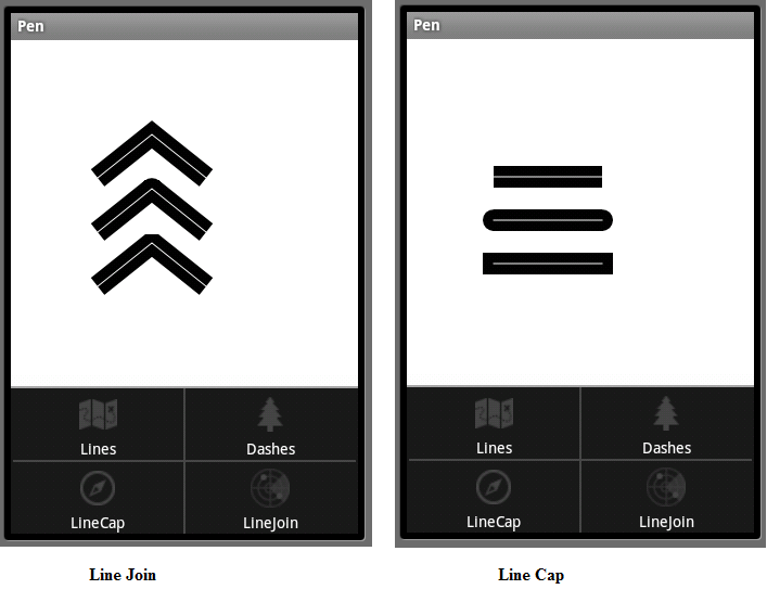 引路蜂二維圖形畫筆(Pen)示例含有四個示例,Lines ,Dashes ,LineJoin 和LineCap。打算采用Option Menu(主菜單) 的方式來選擇不同