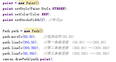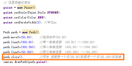 void moveTo (float startX, float startY) 直線的開始點;即將直線路徑的繪制點定在(startX,startY)的位置; void lineTo (float endX, float endY) 直線的結束點,又是下一次繪制直線路徑的開始點; void close () 如果連續畫了幾條直線,但沒有形成閉環,調用Close()會將路徑首尾點連接起來,形成閉環;