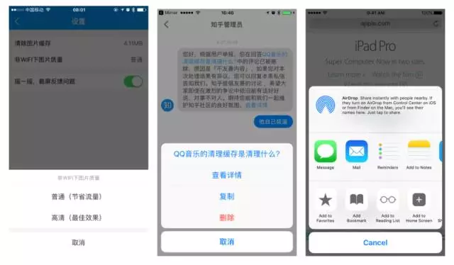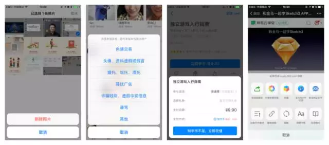 Action Sheet:重要程度弱於Alert時,當需要給用戶更多的功能選擇時使用Action Sheet。一般用戶主動發起任務時用 Action Sheet。