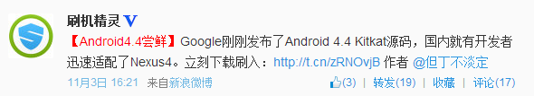 不得不承認,這是個高效率的時代!從刷機精靈微博了解到,上周五,Google發布了Android4.4的源碼,這不,剛過了一天,Nexus 4機型的4.4 ROM就已經率先