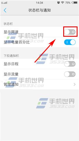 打開手機【設置】找到【狀態欄與通知】,打開後我們再將【顯示網速】那欄右邊的橢圓往右拉打開即可。(如下圖)