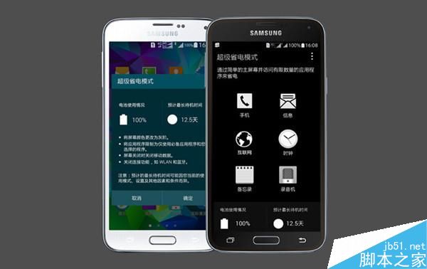 “超級省電模式”,該模式下屏幕的顏色會自動變成黑白,所有非必要的程序都會自動關閉,三星公司表示當手機剩余10%電量進入“超級省電模式”後最多還可以堅持使用24小時。為什麼要把屏幕顏色調為黑白色呢?首先,黑白顏色的界面會降低對手機GPU的處理要求,功耗自然會降低。其次三星S5采用的是Super AMOLED材質屏幕,其一特性是當顯示黑色時屏幕不發光,也就是在減少電量的消耗,這種特性是IPS材質所沒有的。