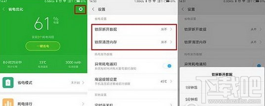 然後我們可以進入省電設置,詳細設置一下省電的方式,建議可以設置一下鎖屏清理內存,並且可以對鎖屏後改動作的執行時間進行設置。