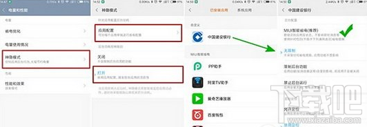打開神隱模式,對應用進行配置,一般情況下,後台自動配置MIUI智能省電。但是我也碰到了一個特殊情況,就是我的建行APP交易自動提醒一直沒有,要打開軟件才會顯示消息。