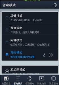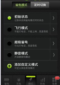 其他三款省電工具的界面顏色都為綠色,象征著環保的概念。唯獨點心省電為藍色,雖然與眾不同,但卻落了下風。它的五個功能按鈕分布在屏幕下方,顯得略為臃腫,其實電量信息可與省電模式合並。它的亮點是將硬件開關放在了首頁,方便用戶使用。