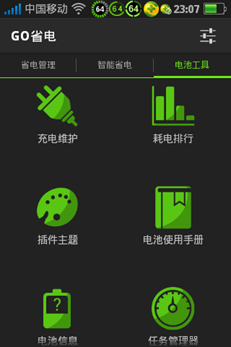 GO省電的上方就是大大的“GO省電”字樣,讓人心情略為不爽,而且它的功能按鈕沒有在底部而是在屏幕的中上部,且字體較小,不易點擊。不過在電池工具按鈕裡,很多工具都是圖形化,這倒算是亮點。