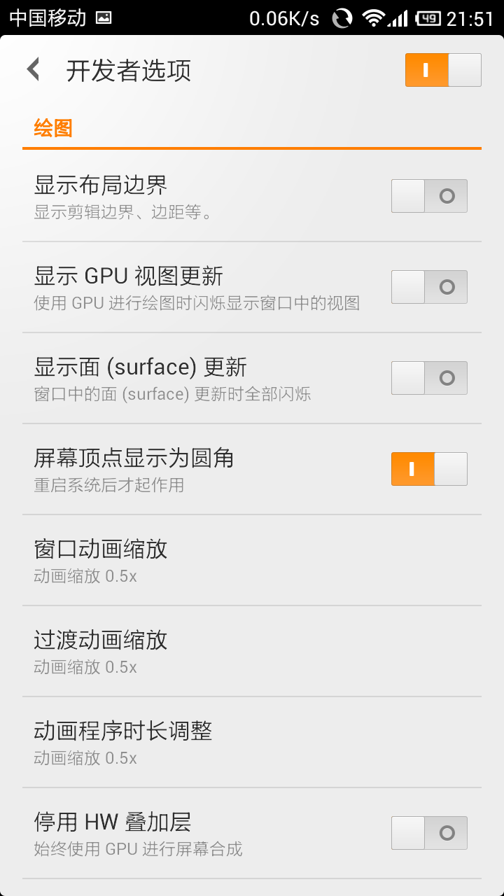 開發者選項,把窗口動畫縮放和過度動畫縮放調成0.5。
