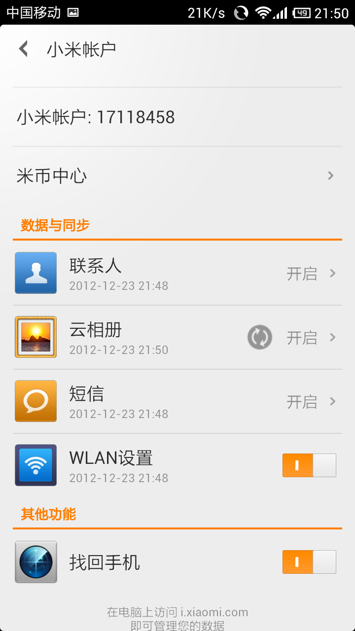 接下來說一下同步,也是在設置進入小米帳號,裡面有電話、短信和相冊的同步,你可以選擇一個或多個,也可以全不同步