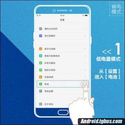一、從OPPO R9第一屏的【設置】進入到【電池】選項,在底部找到【省電模式】,如圖所示: