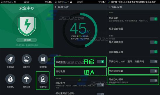 進入OPPO R7Plus手機的安全中心,點擊【電量節省】,開啟【普通省電】後點擊【省電設置】進入,關閉【降低CPU頻率】和【關閉動畫特效】兩個功能右邊的按鈕。(如下圖)