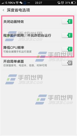 2)找到【深度省電選項】,手機世界小編在此建議大家開啟以下三項:【關閉動畫特效】,【程序即開即用,不允許後台運行】以及【降低CPU頻率】,從而達到最佳省電效果。(如下圖)