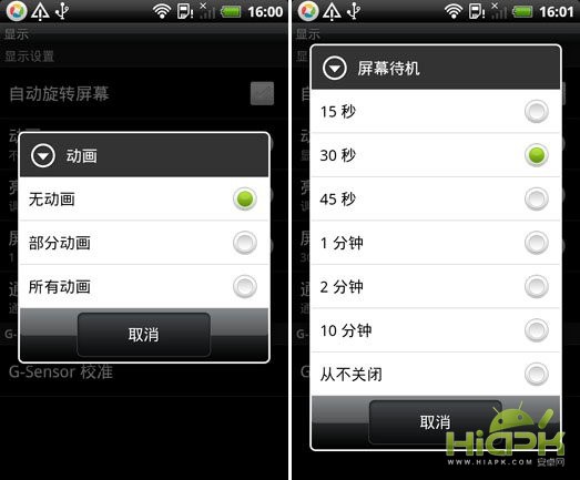 既然手機碩大的顯示屏是手機的耗電大戶,那麼我們首先就拿屏幕開刀。關閉不必要的特效,從而節省電量。1、降低屏幕亮度。通過 設置->聲音和顯示設置->亮度 將屏幕亮度調整到不影響視力觀看的最低亮度,可以有效的節省電量,對於支持光學感應器的手機也可以勾選 “Automatic brightness”根據外界的光線自動調節屏幕亮度。