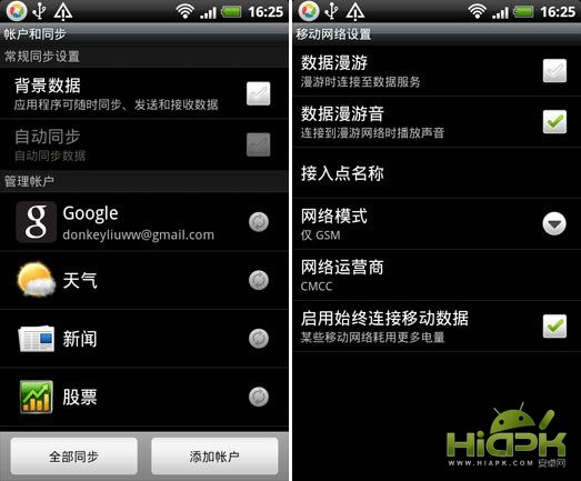 5、關閉賬戶同步,如果你不使用gmail等Google的服務,可以通過 設置->賬戶與同步,取消選擇自動同步功能。使用自動同步將在手機後台自動同步你的日歷,聯系人,gmail郵件和照片到Google服務器,關閉自動同步功能同時也可以節省網絡流量。