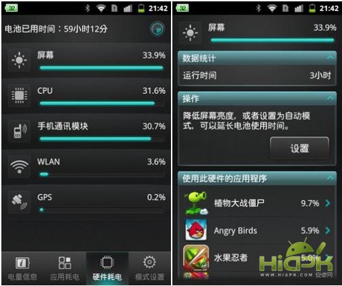 通過以上圖片我們能夠看出,手機的絕大部分電量都被超大的顯示屏幕耗去。另外,無線網絡、手機電視以及游戲應用等也占用了不小的電量。除此之外,還有一些看不到用電情況卻也想到耗電的設置,比如顯示特效,按鍵反饋等。