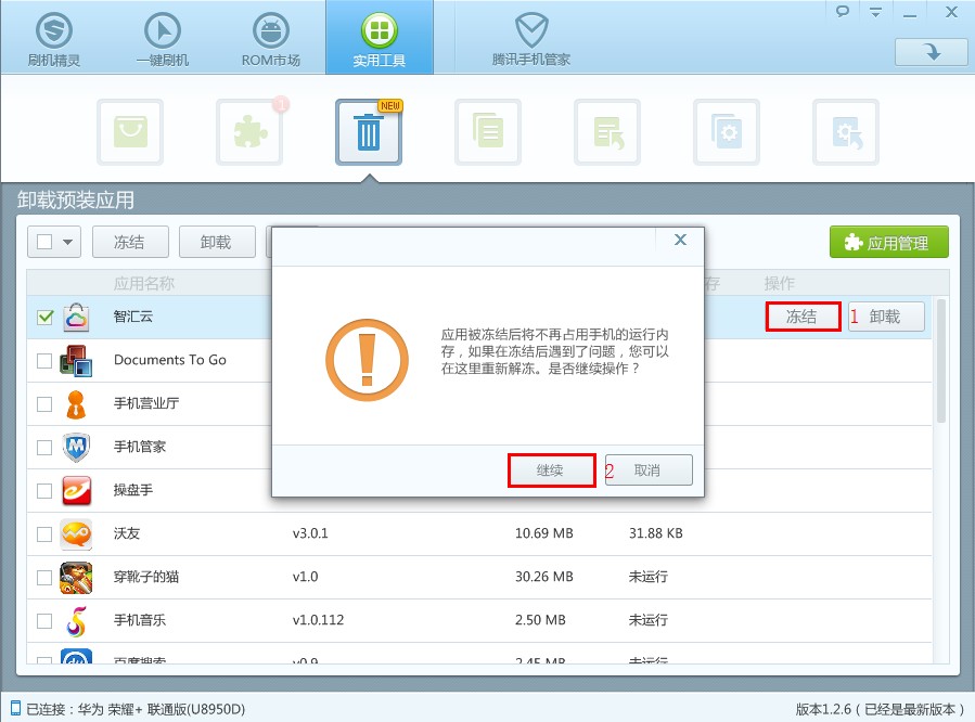 5) 可選擇“凍結”或“卸載”應用,點擊“繼續”,完成操作