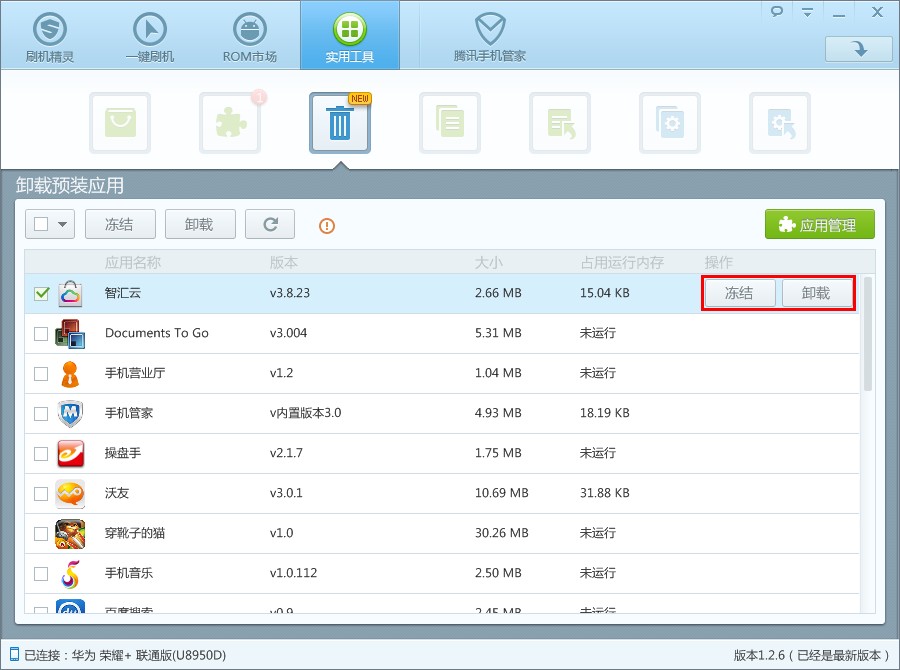 卸載預裝應用功能還貼心地分為“凍結”和“卸載”兩個選項,用戶可選擇直接卸載軟件,也可選擇凍結軟件。“凍結”不會直接卸載應用,而應用凍結後將不再占用手機的運行內存,凍結應用後還可進行“解凍”,恢復應用運行。