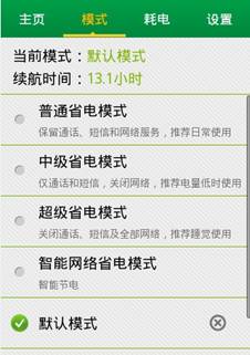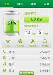 其他三款省電工具的界面顏色都為綠色,象征著環保的概念。唯獨點心省電為藍色,雖然與眾不同,但卻落了下風。它的五個功能按鈕分布在屏幕下方,顯得略為臃腫,其實電量信息可與省電模式合並。它的亮點是將硬件開關放在了首頁,方便用戶使用。