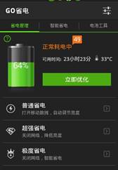 GO省電的上方就是大大的“GO省電”字樣,讓人心情略為不爽,而且它的功能按鈕沒有在底部而是在屏幕的中上部,且字體較小,不易點擊。不過在電池工具按鈕裡,很多工具都是圖形化,這倒算是亮點。