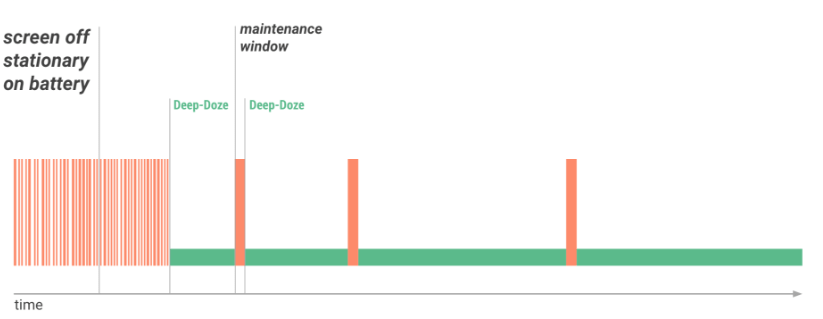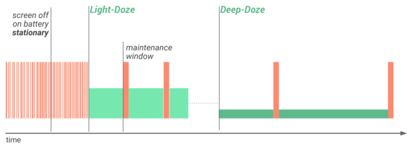 adb shell dumpsys deviceidle get [light|deep|force|screen|charging|network]。在Android Nougat Developer Preview 4中,Doze模式的狀態周期是:
