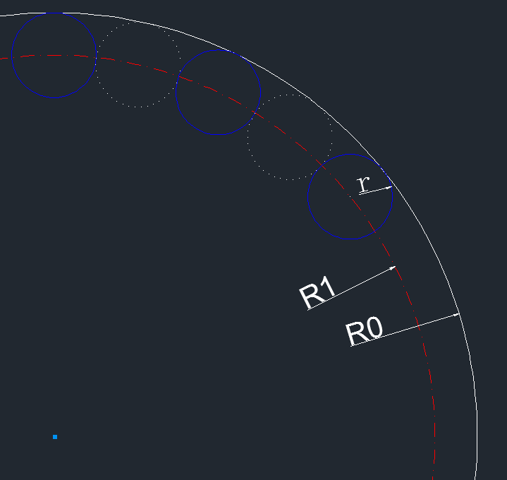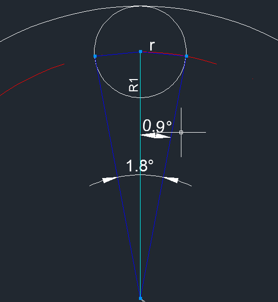 另外200個連續圓點在以R1為半徑的圓上,圓點與圓點都是外切關系。所以每個圓點所占的角度就是360°/200 = 1.8°