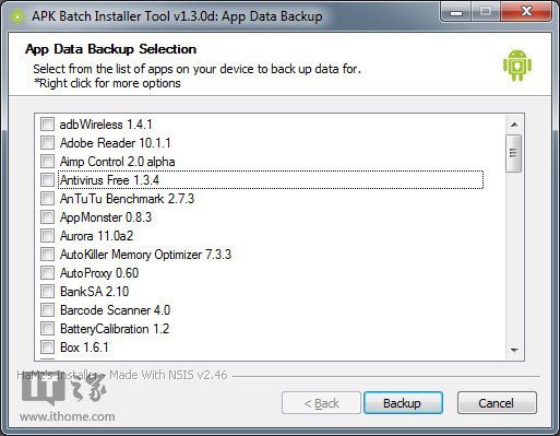 熟悉安卓機的用戶,經常會安裝數量驚人的應用或者游戲,但是對於愛刷ROM的安卓黨而言,如何解決這些應用或者游戲的備份問題,難免頭疼,現在可以借助ABI(APK Batch Installer),一款不足1M的小工具,就可以幫你完成安卓APK應用的安裝和備份任務。