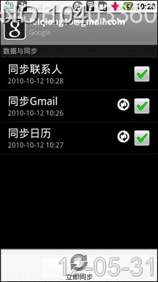 點擊這個賬戶,就能看到如下的同步菜單,在這可以同步您手機上的聯系人,Gmail和日歷備忘錄,這些也都是可選的,需要同步哪個就選擇哪個。