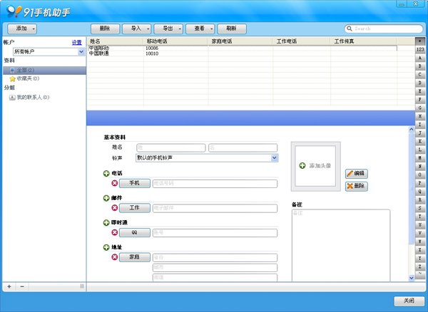 點擊91手機助手主界面上方的資料管理 -> 聯系人,進入聯系人管理界面。