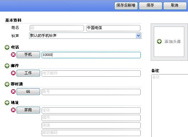 在彈出的界面中填入聯系人信息,點擊右上角的保存即可。