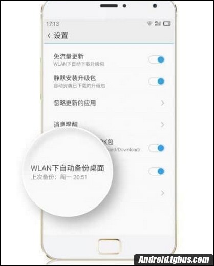 flyme4.5以下的版本,需要到應用中心—我的應用—設置,開啟「WLAN下自動備份桌面」,其余步驟與4.5基本相同。