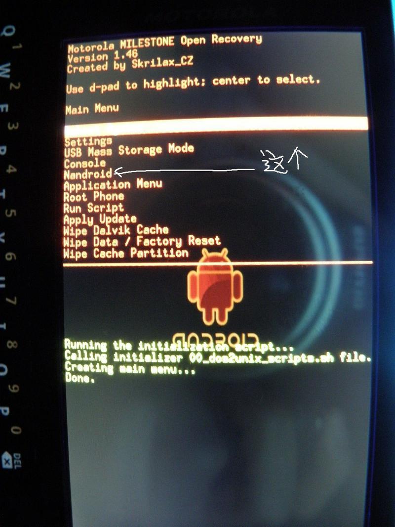 1、進入Recovery,執行 apply sdcard:update.zip進入Openrecovery菜單,可以看到有一個Nandroid選項,Openrecovery版本不同可能菜單布局不一樣,但是這個選項肯定有的,選中並執行它