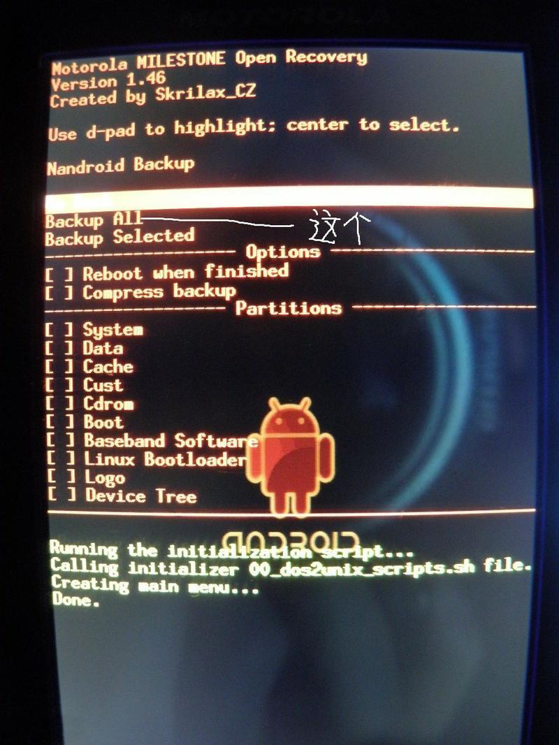 在進入Nandroid的時候選擇Backup,再選擇Backup all即可,備份完成後會在存儲卡根目錄的Nandroid/openrecovery文件夾中生成一個新的文件夾,一般以時間命名,就是你的整個系統的備份,下次有需要時可以恢復。