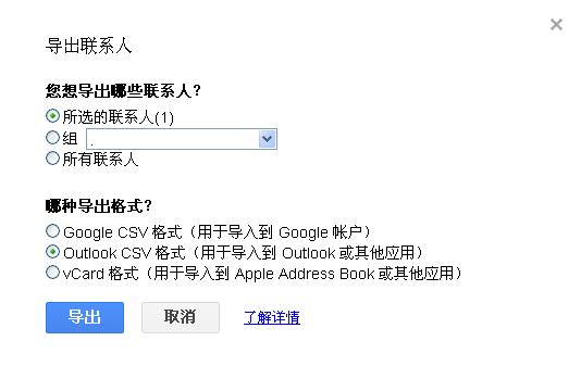 gmail的通信錄的頁面支持通信錄的導入導入,但是導入導出的文件需要滿足一定的格式,首先可以通過gmail的導出功能來確定gmail支持的通信錄格式,導出時選擇Outlook CSV格式