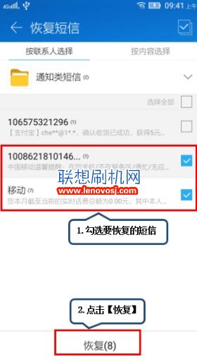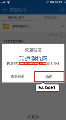 5:在步驟3上圖,點擊“恢復短信”,選擇要恢復的短信後點擊“恢復”,恢復完成後點擊“確定”即可,如圖1-6至1-8所示;