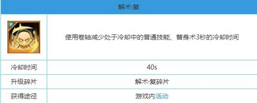 解術·復如果玩家們想要升級這個技能,可以去參加游戲內的活動來獲取各個秘卷的碎片,集齊一定的秘卷碎片就可以升級或者學習新的秘卷技能。