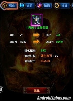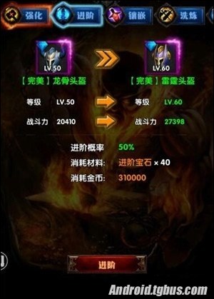 上述截圖顯示完美龍骨頭盔50等級,強化已經滿級,經過進階可以變成完美雷霆頭盔,等級變為60級,戰力也有大幅提升。注意,進階的前提條件是裝備已經達到強化+10等級。