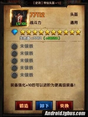 點擊打開上面帝仙頭盔,顯示有5個槽位可以鑲嵌寶石,點擊鑲嵌功能就可以選擇每個槽位嵌入何種類型寶石,寶石有多種類型,包括有加強攻擊,加強護甲,增加命中,吸血,麻痺等等,都會提升你的戰斗力。