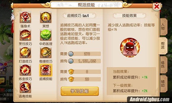 追捕技巧高的人如同鷹一般的敏銳,想在他們面前逃跑難如登天。每學習一級逃離技能,可以減少敵人1%的逃跑成功率。