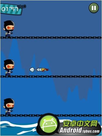 這個關卡的玩法和一個都不能死游戲的玩法非常的像,在游戲中我們可以看到有三個忍者一開始他們三個在不同的道路上面。玩家需要保證這三個人物在游戲中都不能死,其實這些火箭炮射擊也是有規律的。如果說第一次火箭炮在最上面的那條道上,那麼我們需要立刻操控我們的忍者去第二條或者是第三條道路上去。因為在一般的情況下,他在同一條道路上面不會連續兩次發射火箭炮哦!