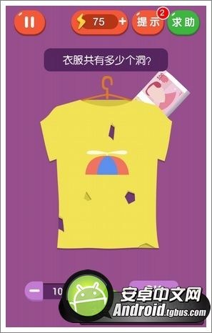 這關一定要學會計算方法,衣服本身有四個洞是領口袖子,衣服上紫色的洞為正反兩面,算2個;黃色的洞只有正面,算1個;側面的洞也算1個,加起來即為正確答案。