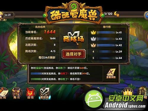在《酷酷愛魔獸》的游戲中,競技場是玩家PK的聖殿,它在游戲中開啟時間較早,只需15級便可進入挑戰。與副本PVE戰斗略有不同的是,競技場由AI全程接管玩家操作,雙方自動戰斗,以考驗玩家對英雄的培養強度為比拼標准。