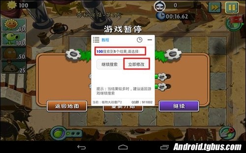 3.點搜索,如果搜索結果較多,就返回游戲,等陽光變化後再搜索。如圖中,變化後,搜索的是100,當前找到了一個結果可以修改了。點擊“立即修改”。