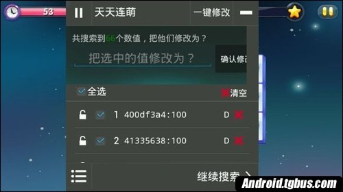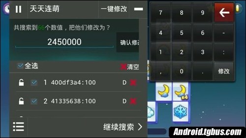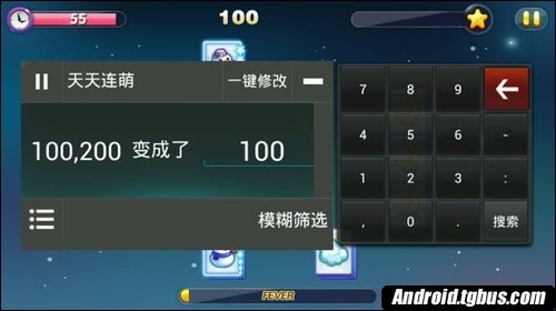 天天連萌刷分圖文攻略: 1.打開天天連萌。 2.搜索100,200。 3.進到游戲裡,消一對然後打開燒餅。 4.這裡注意,修改數值時2500000常常閃退所以輸2450000。 5.然後確認修改。 6.回到游戲中消除一個。 7.靜等游戲結束吧。 以上就是天天連萌閃電模式刷分圖文攻略。大家可以一步一步嘗試一下。而天天連萌普通模式只要消除一個的時候搜索數值改為600就可以了。