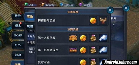參加軍團戰初賽即可獲得大量金幣和軍功獎勵,決賽第一名軍團將獲得大量榮譽,還有特有的軍團頭銜!作為軍團的領袖,將會獲得特有的“首席團長”稱號,其他團員也將獲得“鐵血團員”稱號。同時冠軍軍團將獲得屠龍特權,連續7天屠龍時間增加30%,意味著將獲得更多的龍幣。
