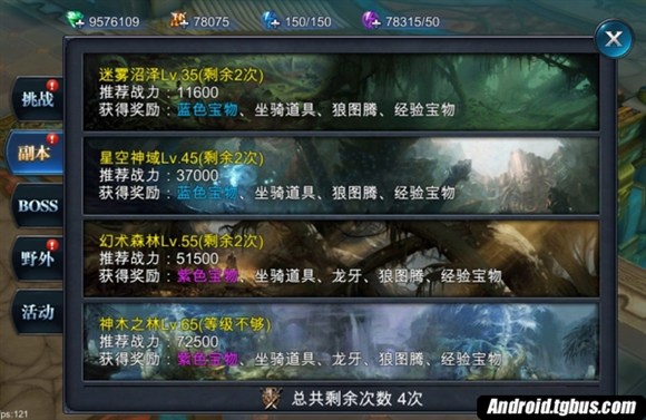 目前游戲中有四個副本可以供玩家挑選,每個副本的難易程度不同,需根據自身的戰力來挑選。等級達到35級的玩家可以開啟第一層次的副本——迷霧沼澤,推薦戰力達到11600的玩家組隊進入;達到45級的玩家可進入第二層次的副本——星空神域,玩家最好是戰力已達到37000,這兩個副本可以獲得的獎勵有藍色寶物、坐騎道具、狼圖騰、經驗寶物等。達到55級的玩家可進入第三層次的副本——幻術森林,推薦戰力已達到51500;達到65級的玩家可以進入最高層次的副本——神木之森,推薦戰力已達到72500,這兩個副本可以獲得的獎勵有紫色寶物、坐騎道具、龍牙、狼圖騰、寶物經驗等。
