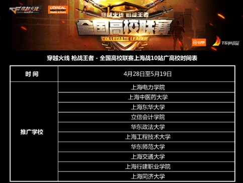 騰訊旗下最火游戲之一《穿越火線(CF)》即將在5月登陸上海各大高校,廣發英雄帖邀電競玩家來一場槍戰“老炮兒”們的對決,並於5月21日決戰上海同濟大學終極“火線戰場”,厮殺出上海CF霸主!