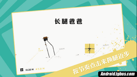《長腿爸爸》玩法十分簡單,輕松就上手,點擊屏幕,長腿爸爸會邁出左腳,再點擊屏幕,邁出右腳,如此不斷點擊,就能讓長腿爸爸不斷邁步行走。說起來容易,但真正做起來卻又是另外一番感受,因為那雙腿太細太長,想要支撐身體前行,對平衡的掌握十分關鍵。在《長腿爸爸》中,掌控好節奏才能讓大長腿邁出歡快的步伐,從而一次次刷新紀錄自我超越,得到無盡滿足感與成就感。
