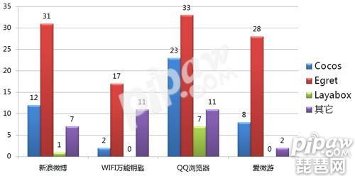 ?從目前國內HTML5游戲四大典型大渠道,即新浪微博(社交型APP類代表),愛微游(微信大號類代表),QQ浏覽器(各大浏覽器類代表),WiFi萬能鑰匙(超級APP類代表)統計的數據來看,在如下二維碼中統計的193款上線HTML5游戲中,使用白鹭Egret引擎的游戲產品,達到109款,占絕大多數。