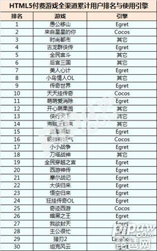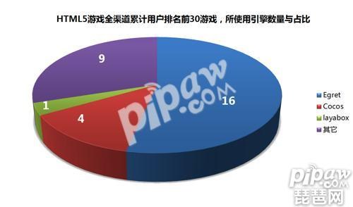 其次,目前HTML5付費游戲全渠道累計用戶排名前30的產品中,使用白鹭引擎的游戲有16款,占比超過50%。