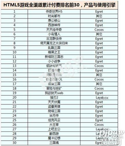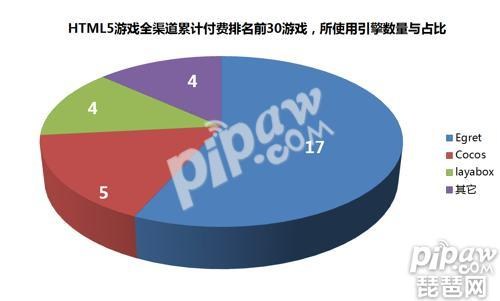 再次,在HTML5游戲全渠道累計付費排名前30的產品中,使用白鹭引擎產品多達17款,占比57%。